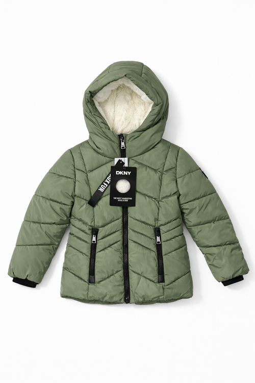 Chamarra de Invierno para Niño DKNY Verde Olivo con Gorro y Forro Afelpado Talla 5/6